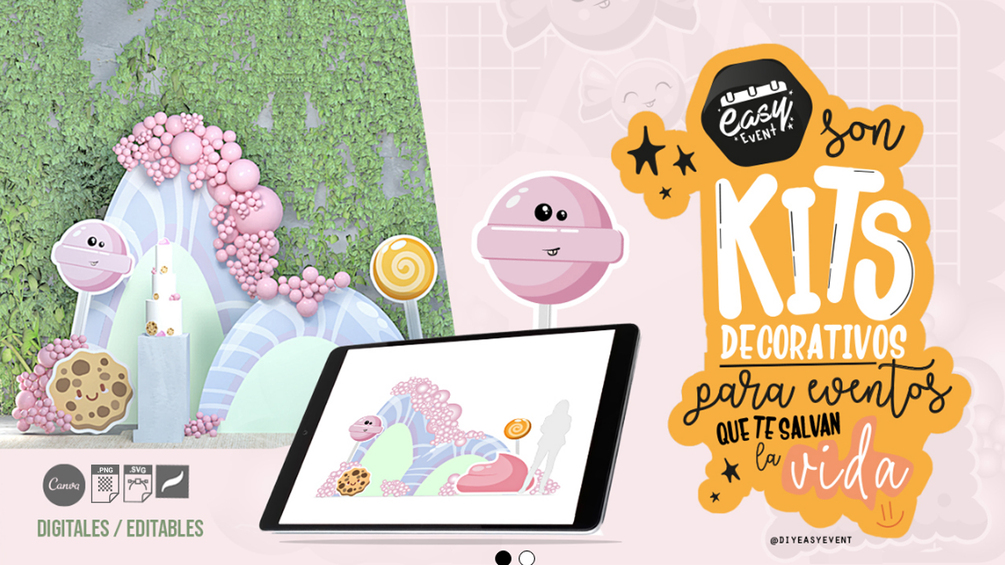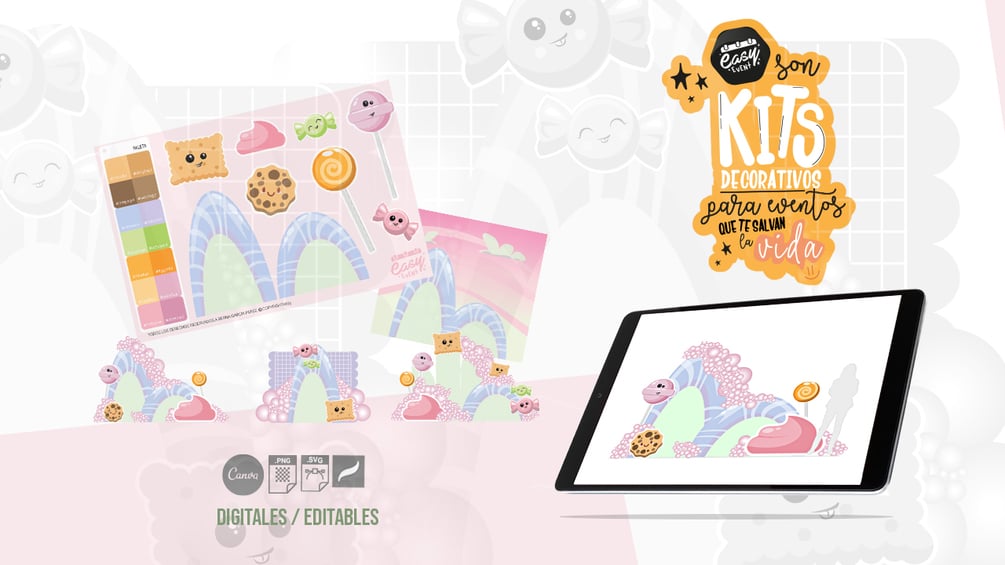 Si eres organizador de eventos y necesitas ideas para ofrecer a tus clientes, este kit de Candy Party es ideal para tu negocio. Ahorra tiempo y dinero en bosquejar ideas. Este pack ya viene listo para editar sus tamaños incluyendo una paleta de colores para que con tus proveedores de material sea un trabajo rápido y eficaz.